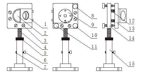 1.光靶放置架 2.反射鏡 3.拉簧鎖緊螺絲 4.調節螺桿 5.調節螺母 6.鎖緊螺絲a7.鎖緊螺絲b 8.調節螺絲M1 9.反射鏡鎖緊片 10.調節螺絲M 11.調節螺絲M2.12.拉簧 13.反射鏡安裝板 14.支撐板 15.底座.