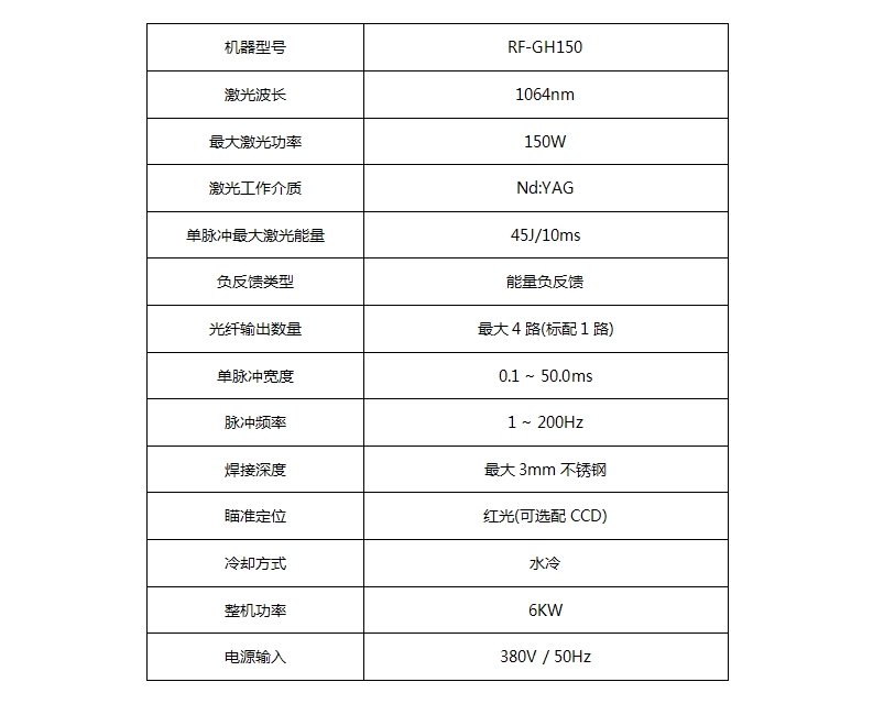 三、RF-GH150單光路光纖激光焊接系統(tǒng)的技術(shù)參數(shù):